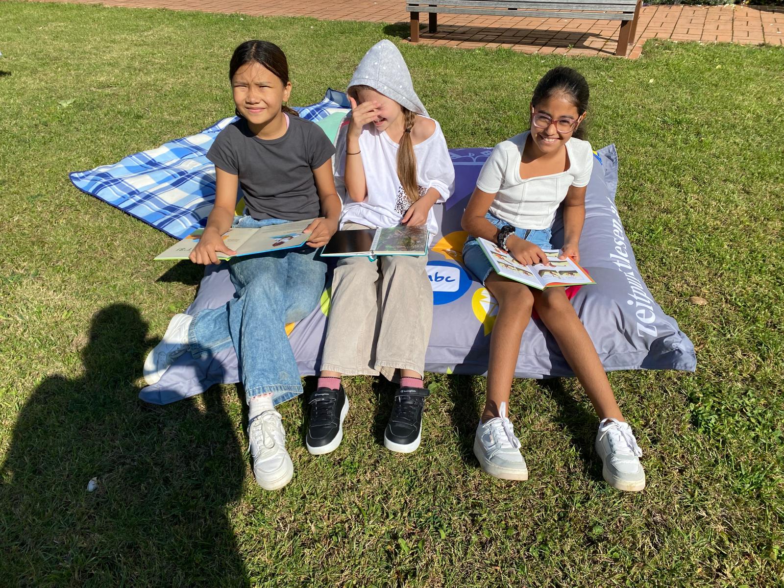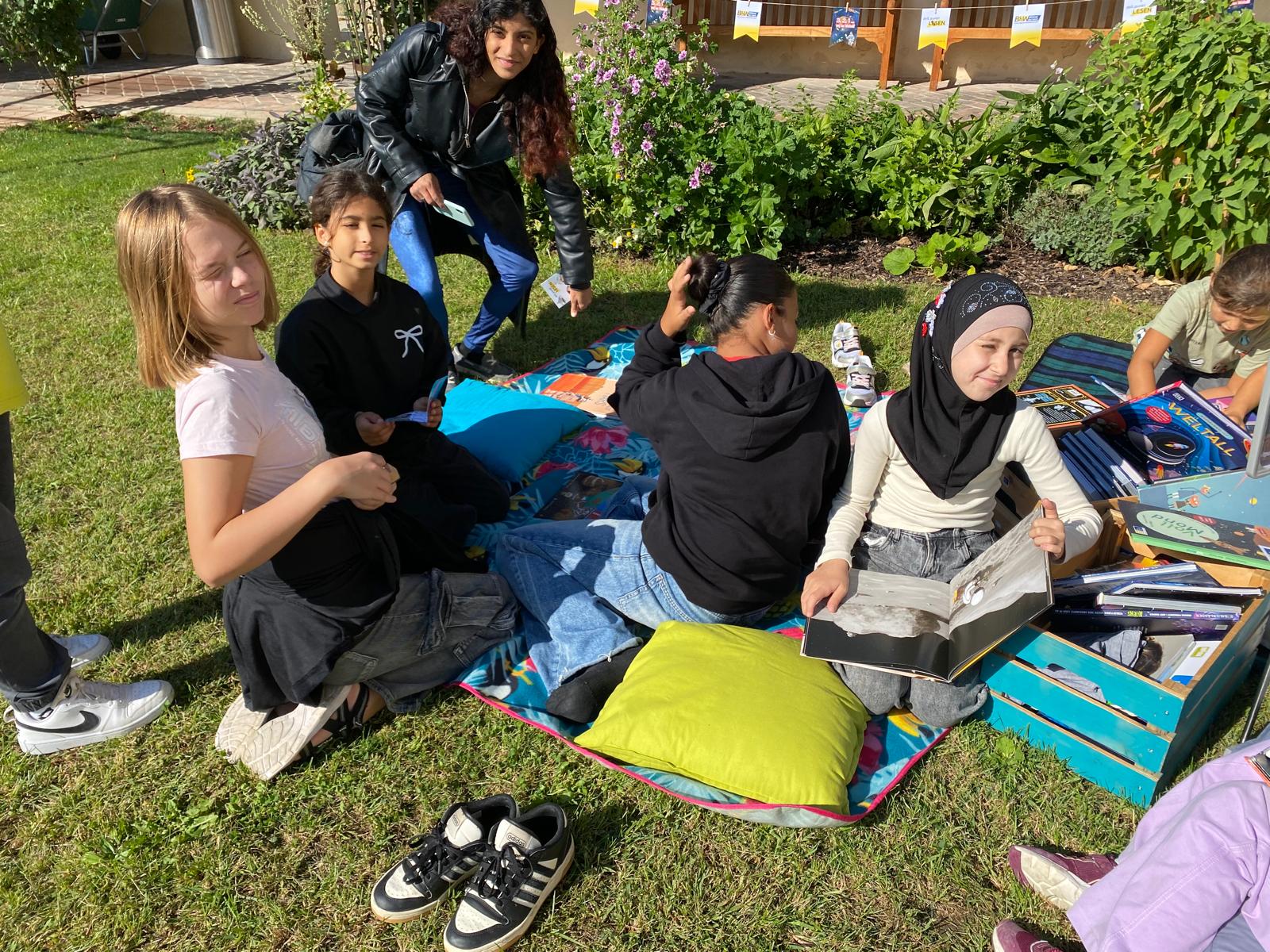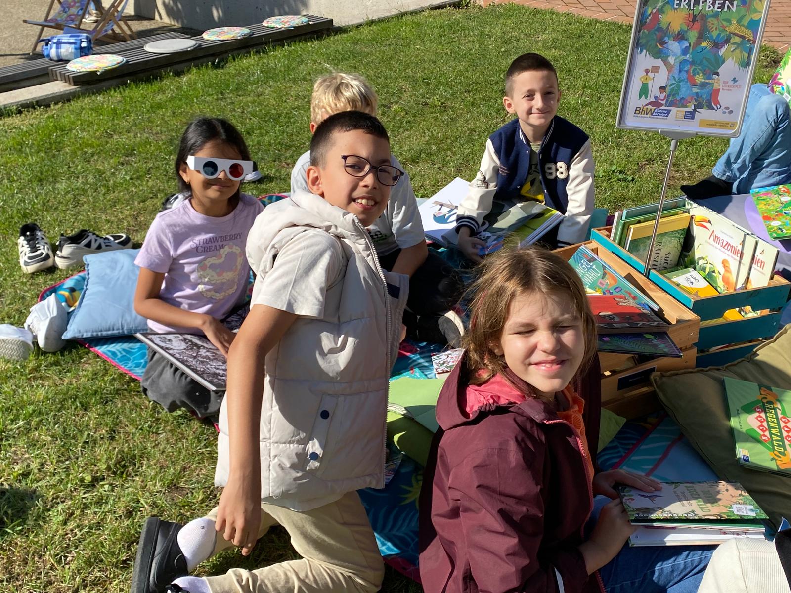 • Die Klassen 4a und 4b beim Lesepicknick im Alluminatsgarten